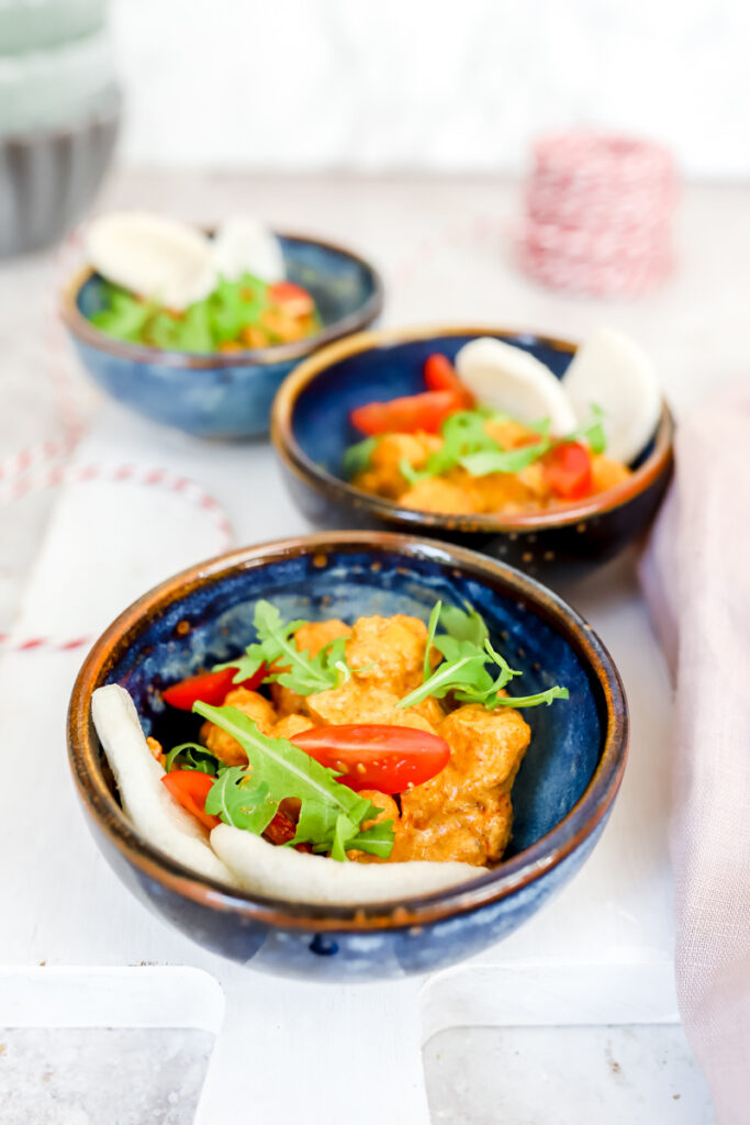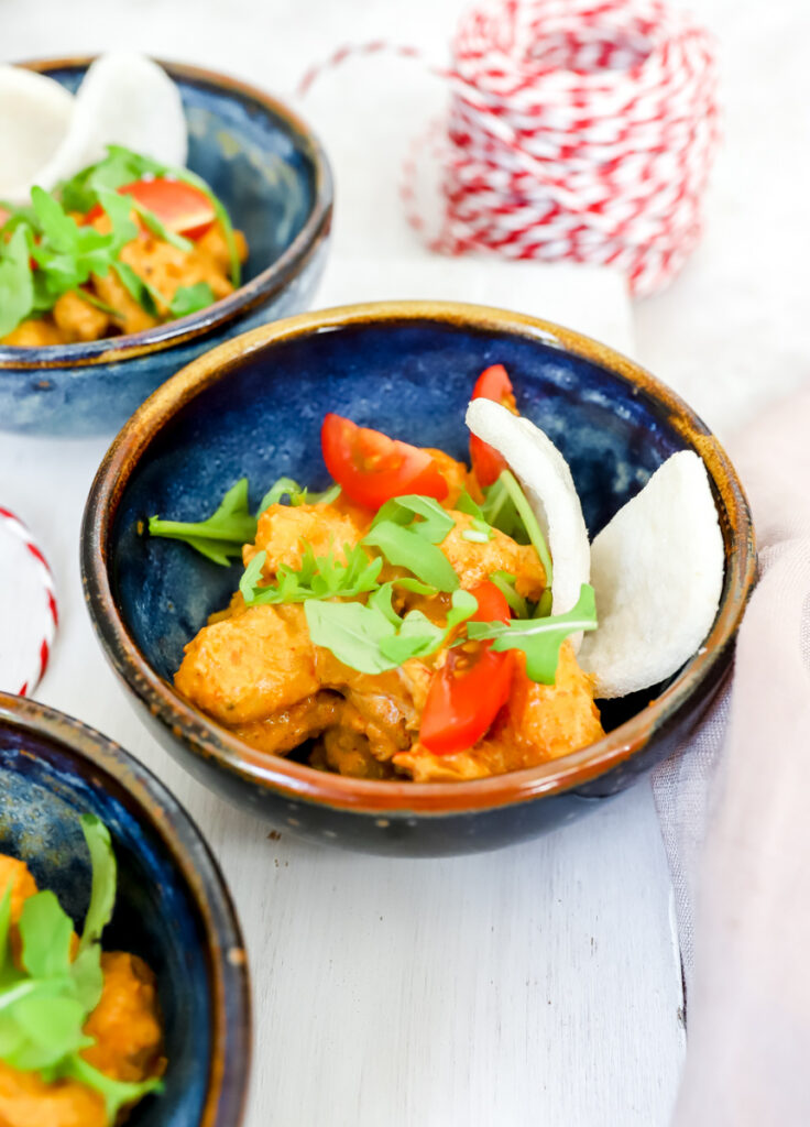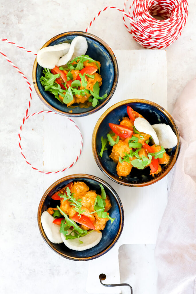 - Verdeel over kleine potjes of glaasjes. Verdeel daarover de kerstomaten en rucola. Druk in elk glaasje een paar kroepoekjes en serveer. Smakelijk!