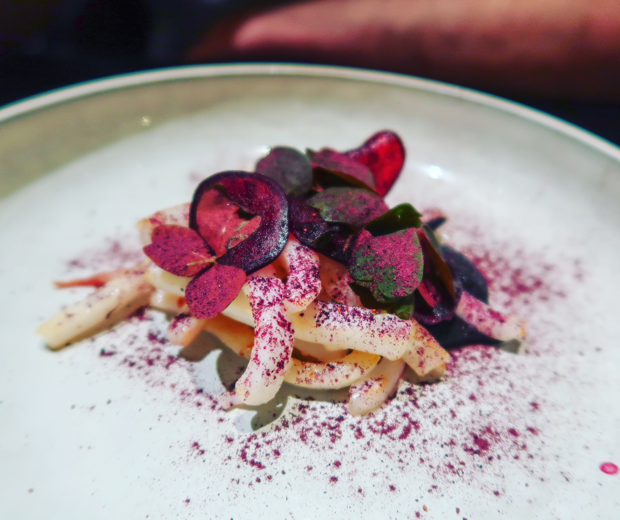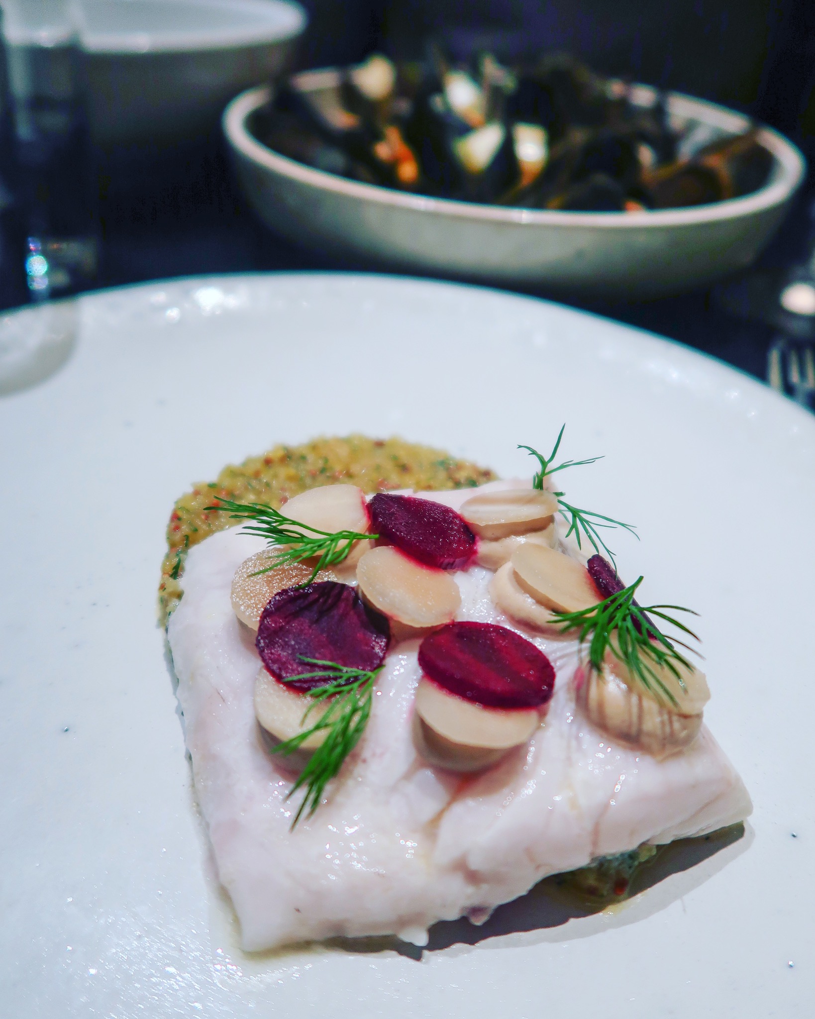 Wij gingen voor mosseltjes in een venkelsausje. Vervolgens kregen we een stukje snoekbaars met een tartaar van gele biet, gepofte rode biet en crème van hazelnoot. Dit gerechtje was helemaal mijn ding, zo lekker! Als volgende kregen we een stukje zeeforel (lijkt wat op zalm, maar is zachter van smaak) met een crème van peterselie en stukjes pastinaak. Als laatste kwam de gegrilde inktvis, met een crème van zwarte look, afgewerkt met stof van gedroogde bosbessen. Ook dit was echt een geweldig gerechtje.