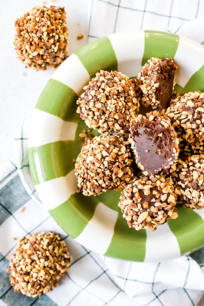 - Leg een balletje op een vork, dip in de gesmolten chocolade. Schud wat af en rol dan door de bresiliennenootjes. Herhaal met alle balletjes.