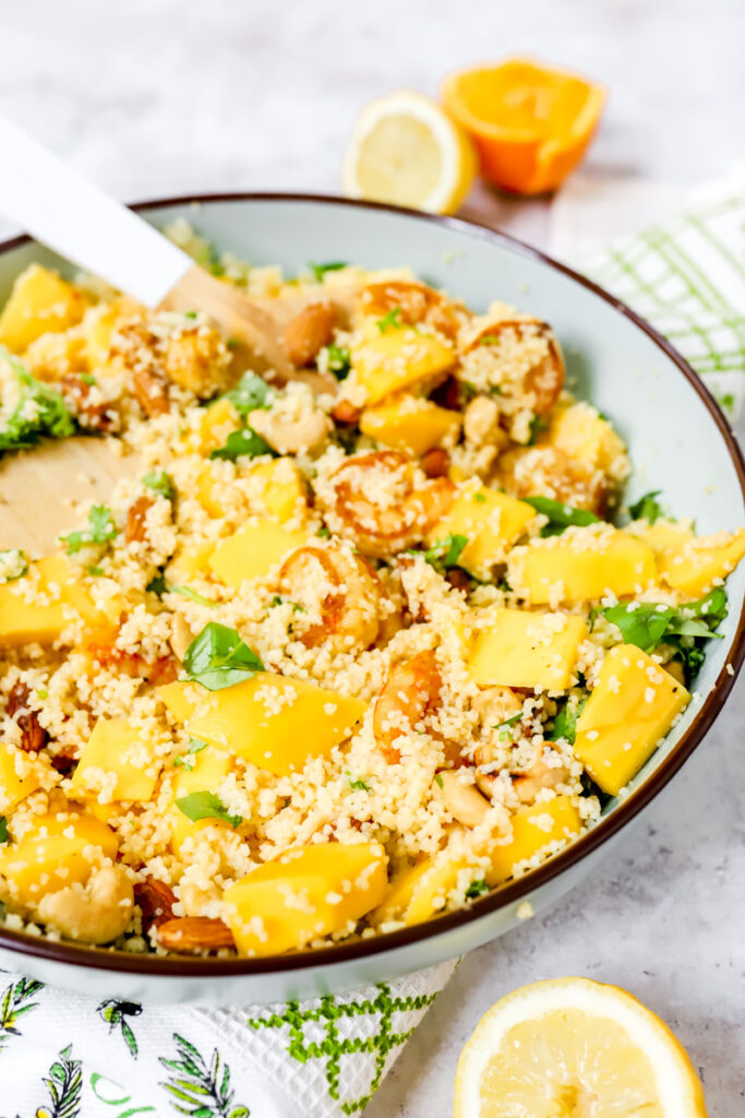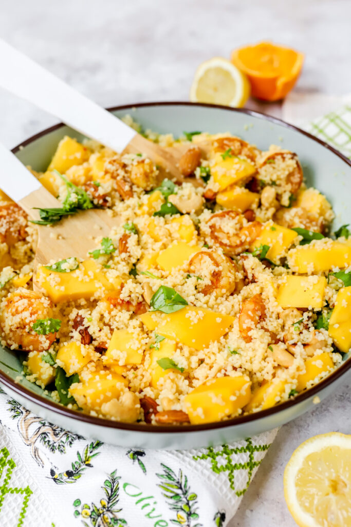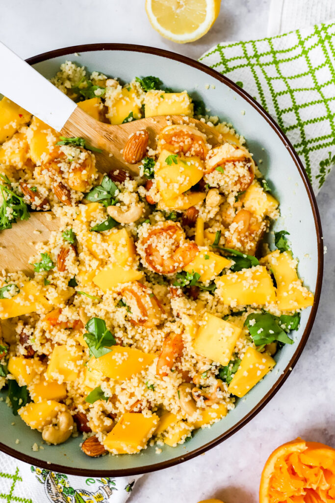 - Wanneer alles afgekoeld is, meng je de couscous, mango, scampi's, noten en peterselie en basilicum.