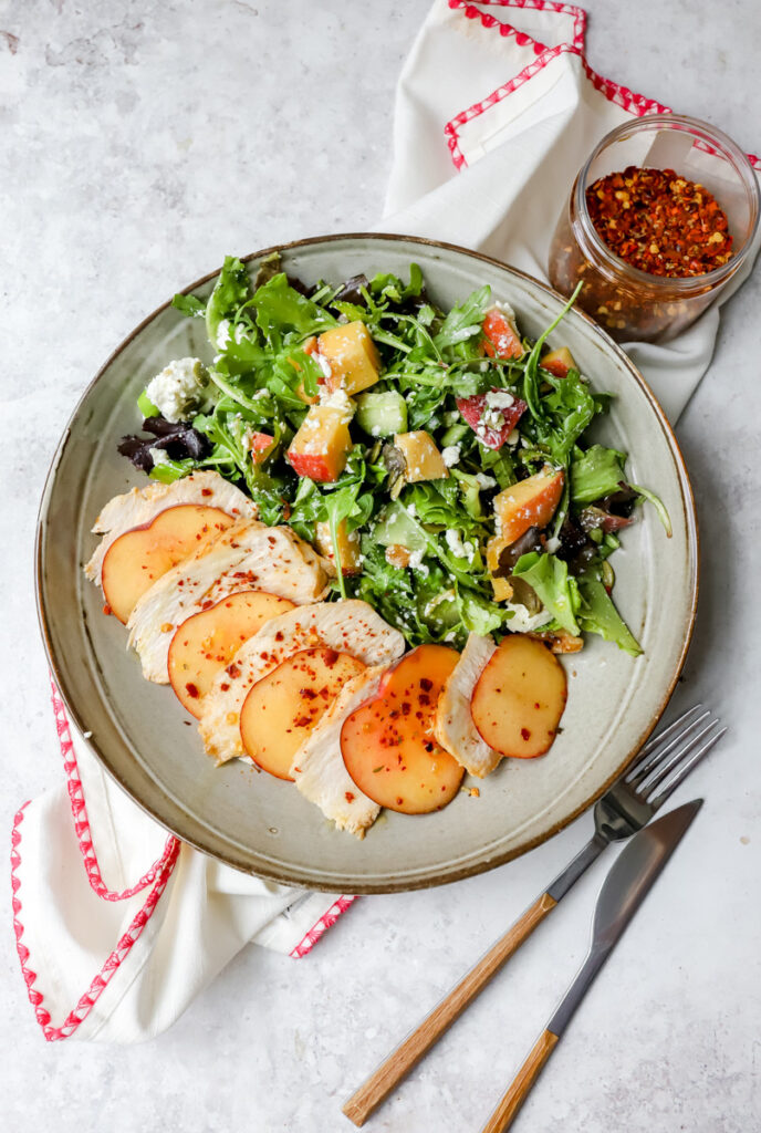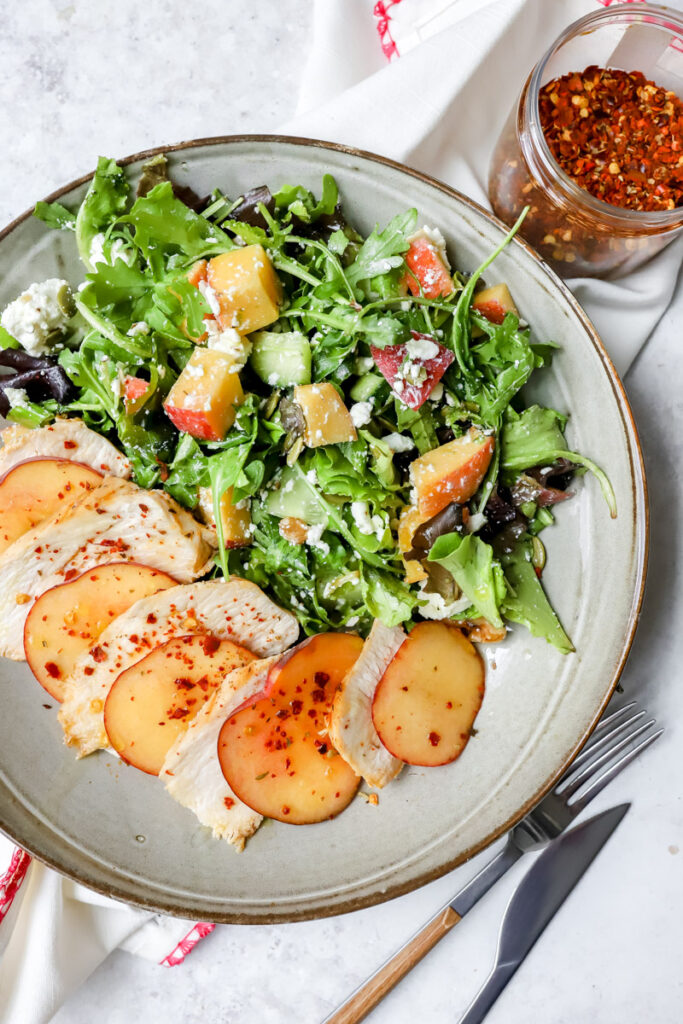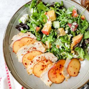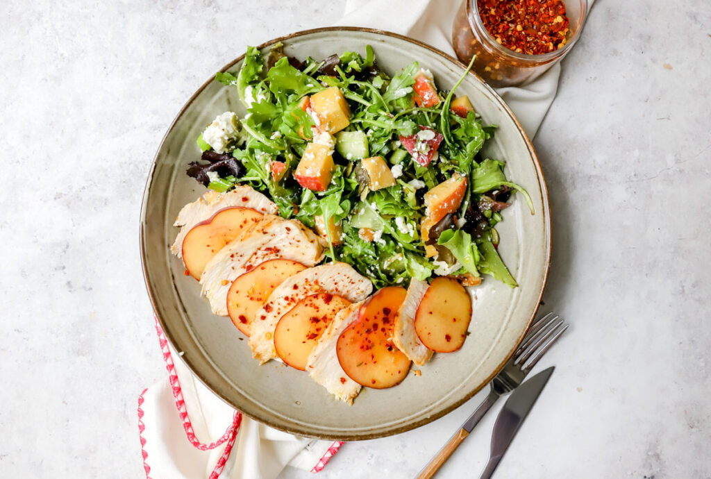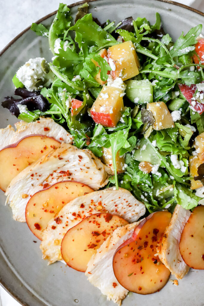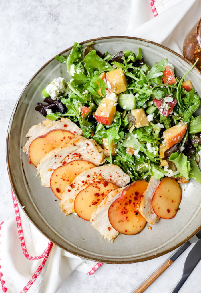 Een heerlijke en frisse salade met gegrilde kip, feta en perzik. Een zomers bordje dat meteen een glimlach op je gezicht tovert.