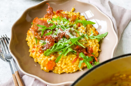 Risotto met pompoen en prosciutto. Ik zit hier gezellig met een lekkere gin tonic en zoutchips voor mijn laptop te schrijven over een heerlijk avondmaal… Risotto! Ik ben er al een eeuwigheid fan van, maar ik moet bekennen dat dit de allereerste keer was dat ik het zelf maakte. Mijn broer kan namelijk nogal goed risotto maken (denk: waterkers, boschampignons,…